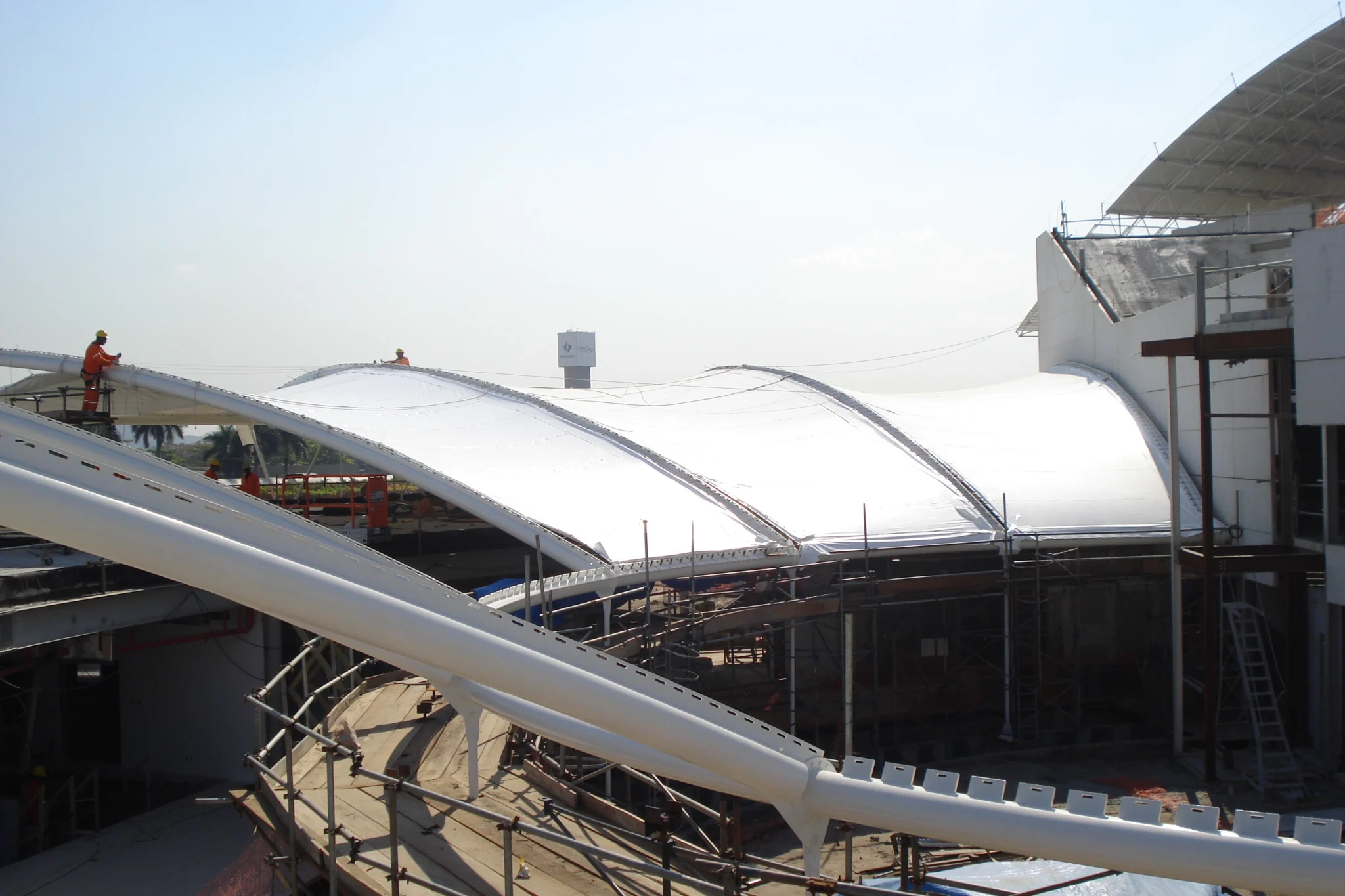 Além de sua resistência e durabilidade, a cobertura tensionada contribui para a eficiência energética do edifício, promovendo sombreamento natural e redução da necessidade de sistemas de climatização, alinhando-se com as melhores práticas de construção sustentável.