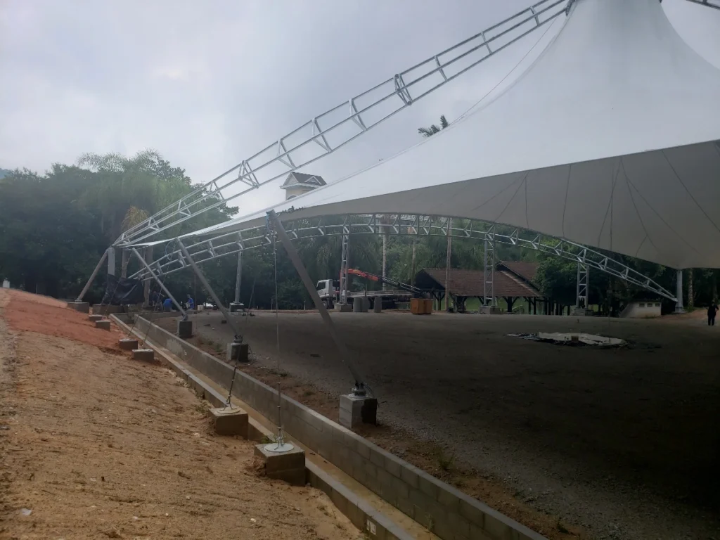 Após a definição do projeto, os módulos metálicos e as membranas tensionadas foram fabricados com precisão em um ambiente controlado. Cada componente passou por rigorosos testes de qualidade e resistência, assegurando a conformidade com as especificações técnicas exigidas.